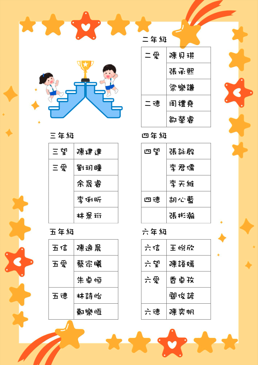 以獎勵每級五名成績進步最多的學生。