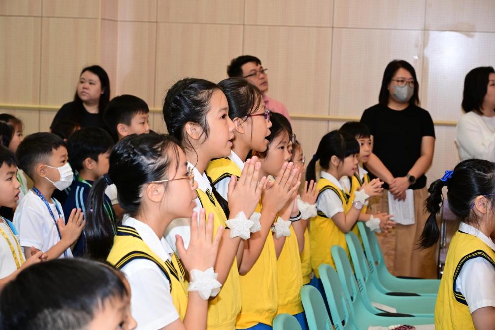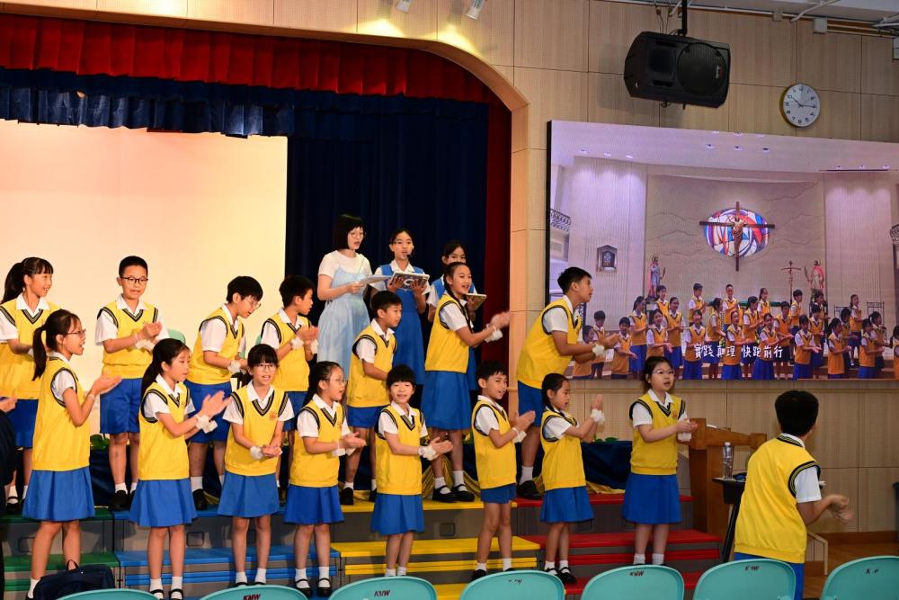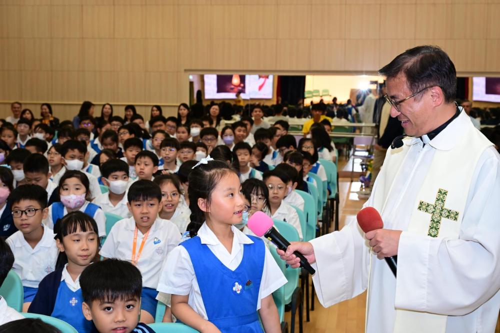 廖神父提醒大家,在新學年中要謙卑自守,敬主愛人,並以真理與愛作為生活的指引,成為耶穌的見證者。祈禱會最後以本年度 Action Song《跟主天際飛》作結,全校師生齊心合唱,舞蹈、歌詞和旋律簡單易學,學生投入演出,場面熱烈感人。大家立志願意跟隨天主,在學習與生活中實踐信仰與愛德。